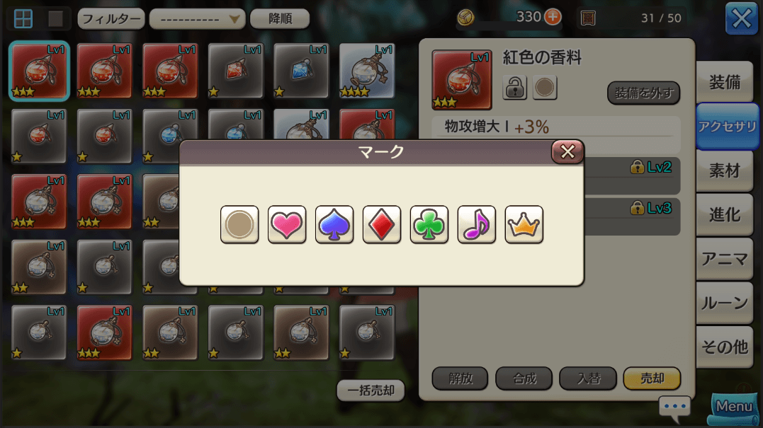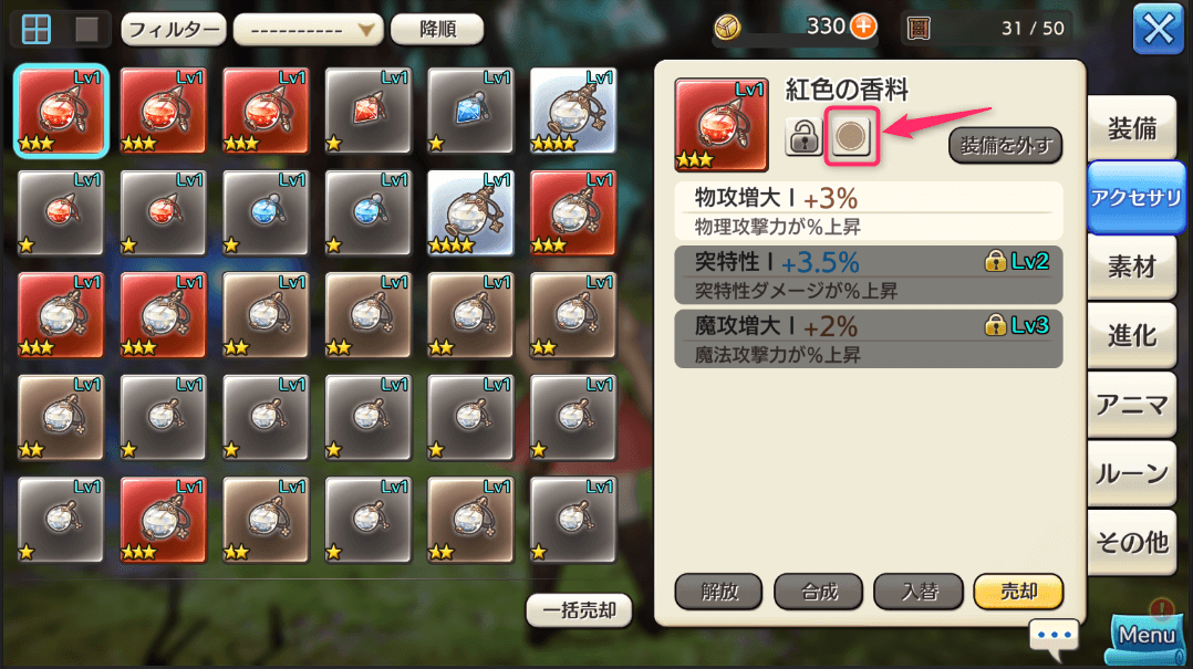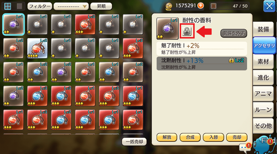 保護されたアクセサリは解放/入れ替え時の素材から表示されなくなり、売却することができなくなります。