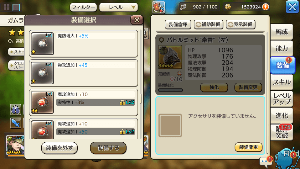 アクセサリは、右下のMenu→キャラ→装備タブから自由に装備したり、外したりすることができます。