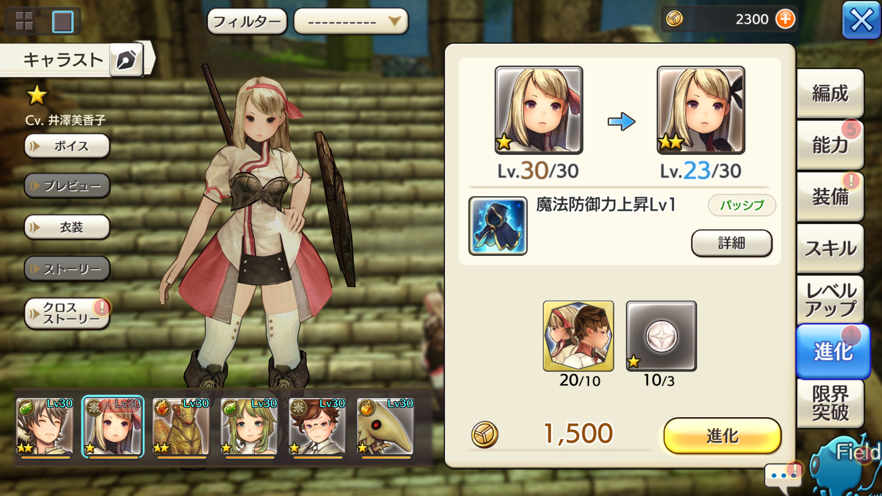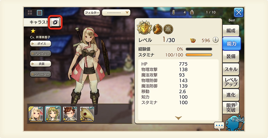 | 知力 | アクティブスキルのチャージタイムに関係するステータスです 知力が高いと、アクティブスキルのチャージタイムが減少します |