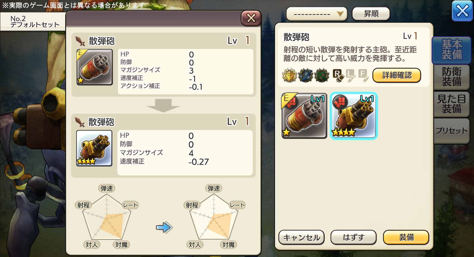 装備には種類毎に固有のパラメータが存在し、1発の弾が大きい代わりに移動速度に大きい下降補正が掛かるなどの特徴があります。