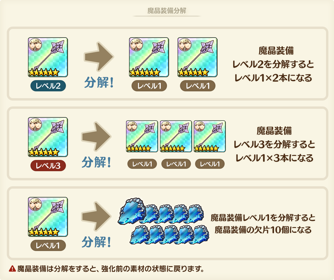 ※レベル2以上の魔晶装備は分解することによりレベル1の魔晶装備を取り出すことができます。
