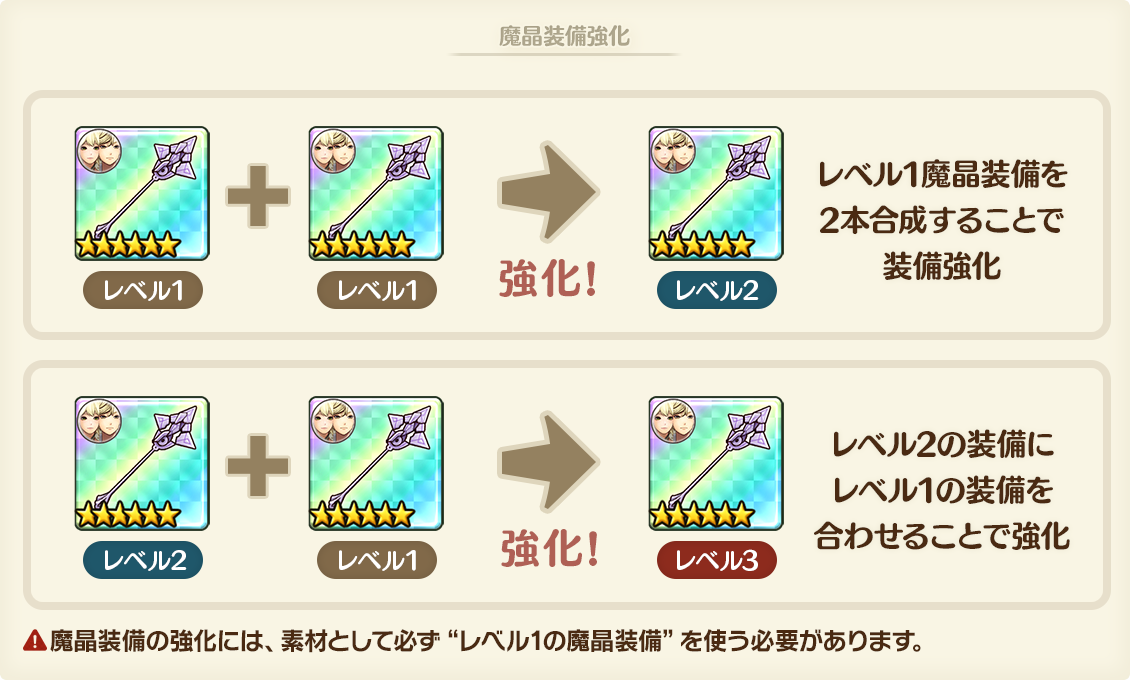 ※魔晶装備の強化には、素材として必ずレベル1の魔晶装備を使う必要があります。