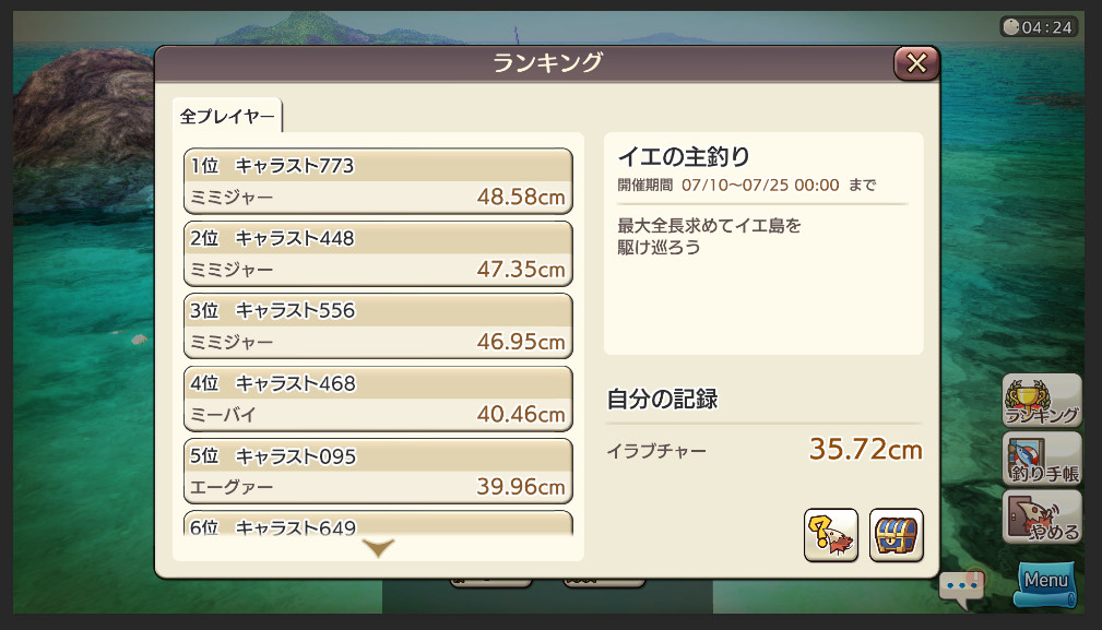ワールド内の冒険者全員で、釣った魚のサイズを競うランキングです。