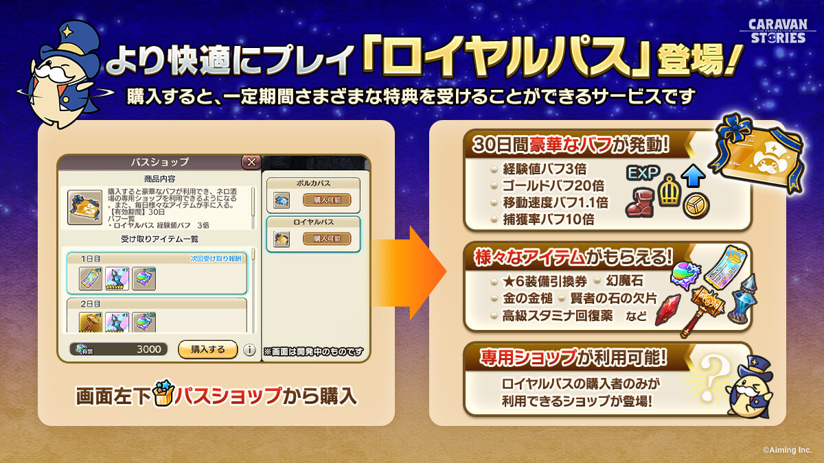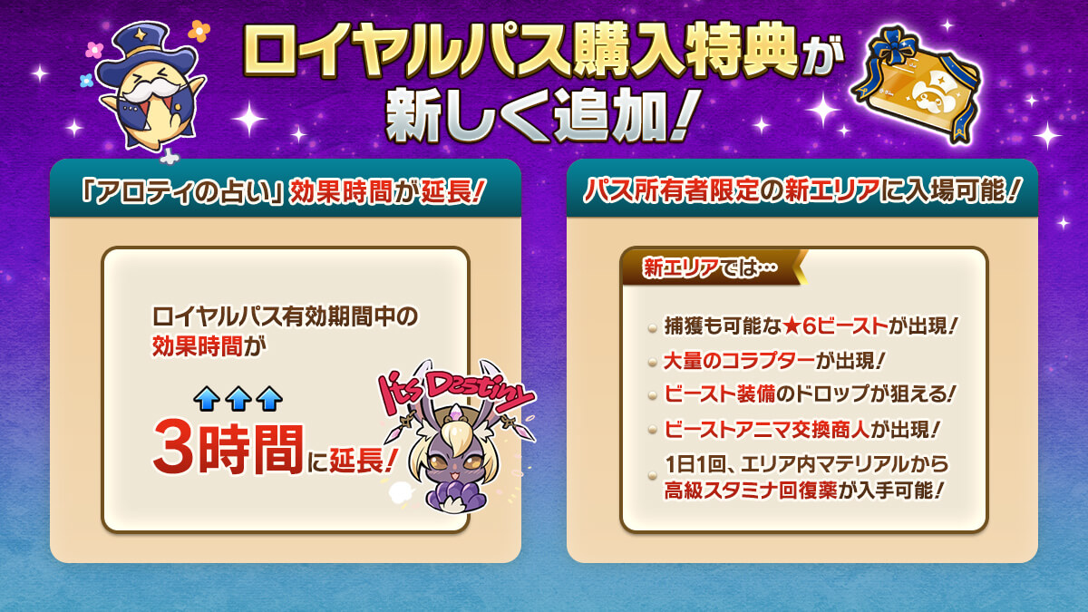 ロイヤルパスに加入中「アロティの占い」の効果時間が一律3時間に延長します。