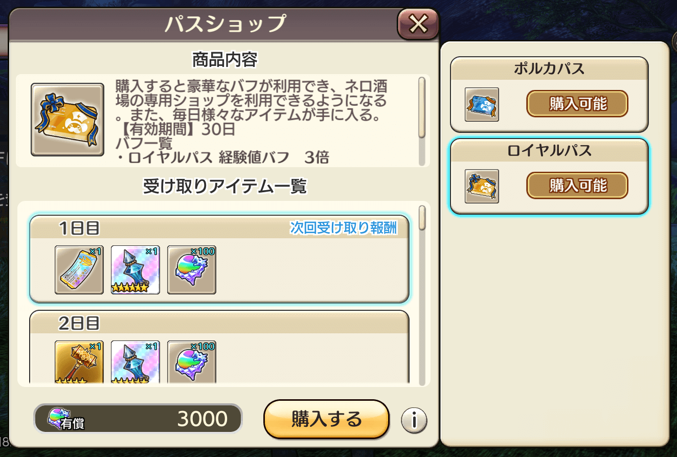 パス加入中に丸1日以上ログインしない期間があった場合でも、次回ログイン時にログインしなかった日のデイリー報酬もまとめて受け取ることができます。