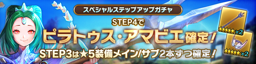 加えて、STEP3以降で「ピラトゥス・アマビエ(限定ヒーロー)」の★5メイン/サブ装備が出現する場合、必ず2本で出現いたします!